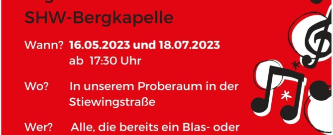 Komm und mach mit! Offene Mitmach- und Infoprobe des Jugendorchesters der SHW Bergkapelle Wir möchten euch alle am 16.05.2023 und am 18.07.2023 jeweils ab 17:30 Uhr zu unseren Mitmach- und Infoproben in unseren Proberaum in der Stiewingstraße einladen. Eingeladen sind alle, die bereits ein Blas- oder Schlaginstrument spielen sowie alle, die ein Blas-
